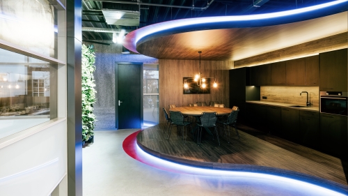 In het ontwerp van deze kantoorruimte is gekeken naar openheid: de werkplekken, kantine en showroom bevinden zich in dezelfde ruimte maar zijn toch van elkaar gescheiden. Met als eyecatcher een greenwall midden in de ruimte!
