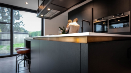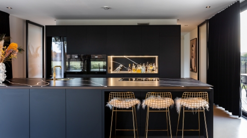 De kern van dit huis is deze maatwerk keuken. Door de verschillende contrasten wordt het design spannend en trekt het de aandacht.